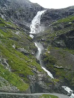 Trollstigen mountain pass and hairpin road with waterfall