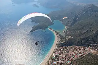 - Paragliders launch from the cable-car top station of Mt. Babadağ. The parachute is already open on launch, and an experienced pilot can soar along the mountain updraughts for hours before landing on the beach. Beginners take a tandem-ride, strapped in front of an instructor, for a one-hour flight — you need proper trainers, not flip-flops or barefoot. Operators may pick up from hotels here and in Fethiye.