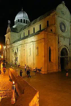 - 🌍 Katedrala sv. Jakova (Cathedral of St. James or Cathedral of St. Jacob), Trg Republike Hrvatske 1. 9:30-18:30. This basilica is considered as one of the major attraction in the city. It is on the UNESCO World Heritage list. Construction started in 1431, and it was not finished until 1536 due to Turkish wars. Several successive architects built it completely in stone in the 15th and 16th centuries, both in Gothic and in Renaissance style. The interlocking stone slabs of the Cathedral's roof were damaged when the city was shelled by Serbian forces in 1991. The damage has since been repaired. It has a beautiful baptistery worth seeing it, and the curiosity is it has been built with stone only, without any kind of binder. Another one is 72 human heads carved in stone on the external part which belong to unknown individuals, passers-by, sailors, merchants and peasants who posed as the cathedral was being built. Statues of Adam and Eve are also curious; Adam is covering his breasts, and Eve is covering not her breasts, but her stomach. €2.