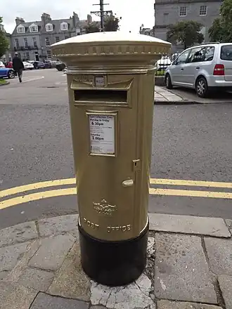 Golden post boxes honour local winners of gold medals at the 2012 London Olympics: on Castlegate for rower Katherine Grainger, on Golden Square for Paralympic cyclist Neil Fachie, and in the nearby town of Westhill for canoeist Tim Baillie.