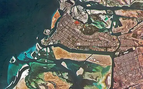 Most of Abu Dhabi is on a wedged-shaped island that lies from northwest to southeast, connected by three bridges to the mainland, and other bridges to other islands, most of which also eventually connect to the mainland. The main island features many 'superblocks' with wide, multi-lane roads dividing them and buses running routes along them. The other islands include: