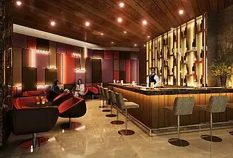 - 🌍 Aloft Abu Dhabi, Atop the National Exhibition Centre, ☏ +971 2 654 5000. Trendy hotel with cool dark colors, attractive young hotel desk clerks, relatively small rooms (beds are comfortable though), good restaurant and lobby bar, fantastic outdoor lounge on the roof, and half-empty disco next door. Great if there's a convention, but it's walkable to nothing else. Car or taxi is needed to get just about anywhere. Maybe when the nearby residential/commercial development is ready in a few years, it might be more desirable. 4-star with few amenities (you bring your own bags to the room), but there is still a definite sense of style.