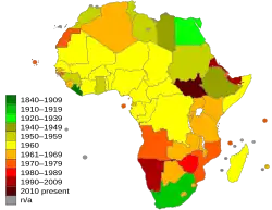 The decolonisation of Africa began with Libyan independence from Italy in 1951. Colonial powers employed varying means of control over their colonies, some granting natives representation in the government and cultivating a select few civil servants while others maintained a firm grip with an all-European government. In some countries, nationalist movements were quashed and their leaders killed or jailed, while others were able to peacefully achieve independence. In the 1950s, Guinea, Ghana and North African nations gained independence non-violently. In Algeria, France violently fought independence movements until 1963. With the establishment and new constitution of France's Fifth Republic in 1958, French West Africa and French Equatorial Africa ceased to exist, and after a brief "community" with France, the countries of these regions gained independence in 1960. By 1970, all but a handful of African nations were at least nominally independent. However, France made its former colonies and in West and Central Africa sign treaties that gave France control over their natural resources and monetary policy, and retains more influence in Africa than the other former colonial powers. The Portuguese bitterly fought to maintain their African possessions until 1975; all but one gained independence through war. Zimbabwe was the last major colony to gain independence from a non-African colonial overlord, in 1980, following a 14-year period of rule by a white minority government not recognised by Britain, the former colonial power. In 1990, semi-autonomous Namibia gained independence from South Africa and in 1993, Eritrea separated from Ethiopia following a protracted war – a peace deal was only achieved in 2018. South Africa remained under firm control by its white minority, oppressing its black, Asian and mixed-raced populations under a system called apartheid until 1994. Morocco maintains control over Western Sahara despite an established independence movement, and this remains a point of contention between Morocco and Algeria. The conflict flared up again in 2020. Following years of civil war, South Sudan became independent from Sudan after a referendum was held in 2011.
