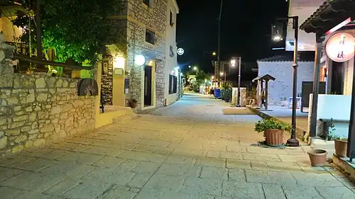 In 1995, the inhabitants of Aphytos, resisting the wide use of concrete in modern villages, and supporting the initiatives of the then president of the village, Vasili Pavli, pushed forward the idea of a traditional village by re-erecting the old stone houses, paving the streets, creating pavements, etc. So the old local porous stone quarries reopened and today every contemporary edifice is built with the local stone.