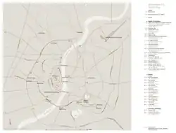 The city was built in an open and spacious plain to the east of the Sabarmati River. It included a smaller known fort as Bhadra Fort. The city wall had twelve gates. The city gradually expanded in every direction, with well laid out beautiful buildings, lakes and mosques on both sides of the river.