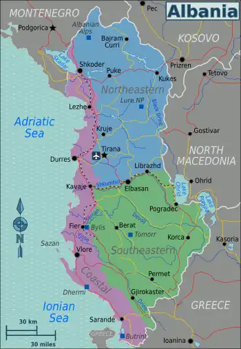 | Coastal Albania, Albanian Riviera the long narrow strip between about 10 and 30 km wide along the whole Albanian coast, bordering both the Adriatic Sea and Ionian Sea. |