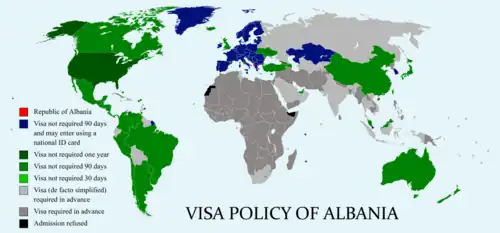 According to the Ministry of Foreign Affairs, nationals of the following countries and territories can enter Albania without a visa: Andorra, Argentina, Armenia, Australia*, Austria*, Azerbaijan, Belgium *, Bosnia & Herzegovina, Brazil, Bulgaria*, Canada*, Chile, Croatia, Cyprus*, Czech Republic*, Denmark*, Estonia*, Finland*, France*, Germany*, Greece*, Holy See, Hong Kong SAR, Hungary*, Ireland*, Iceland*, Israel, Italy*, Japan, Kazakhstan, Kosovo, Latvia*, Liechtenstein, Lithuania*, Luxembourg*, Malaysia, Malta*, Monaco, Montenegro, Netherlands*, New Zealand*, North Macedonia, Norway*, Poland*, Portugal*, Romania*, San Marino*, Serbia, Singapore, Slovakia*, Slovenia*, South Korea, Spain*, Sweden*, Switzerland*, Taiwan (Republic of China), Turkey, United Kingdom*, USA*, Ukraine.