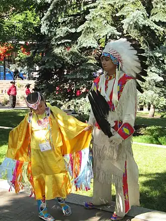 Dancers at the Calgary Stampede powwow. They are wearing "regalia" never called "costumes".