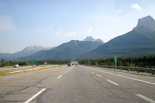To enter from British Columbia, there are a limited number highways (generally through mountain passes) that can be used, from north to south the most notable are where Highway 2 (in British Columbia) / Highway 43 (Alberta) crosses near Dawson Creek, Highway 16 (Yellowhead Highway) at Yellowhead Pass in Jasper National Park, Highway 1 (Trans-Canada Highway) at Kicking Horse Pass, Highway 93 crosses at Vermilion Pass, and Highway 3 (Crowsnest Highway) Crowsnest Pass.
