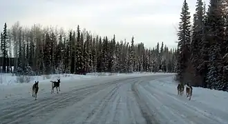 The two biggest dangers in Alberta are the weather and the wildlife. Other people aren't much of a problem. Pictured are white tailed deer running along an icy road in rural Alberta.