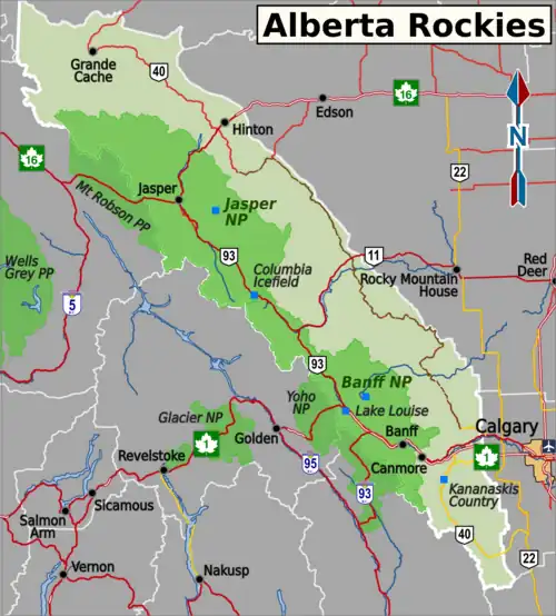 The Alberta Rockies are the portion of the Rocky Mountains in western Alberta, Canada. This region attracts many visitors with its beauty, outdoor activities and two of Canada's oldest and best known national parks, Banff National Park and Jasper National Park.