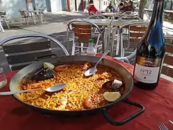 Albufera is known as the birthplace of Valencia's most famous rice dish, paella, which is believed to have developed from its Arabic roots into its current modern form around the mid-19th century. The most traditional version is paella valenciana, which includes white and green beans, chicken, rabbit, snails, and occasionally artichokes. Other versions include paella marisco, which replaces the meat with seafood and eliminates the green vegetables, and paella vegetariana, or vegetarian paella. Other local dishes include all i pebre, a stew with peppers, garlic, potatoes and eels, and espardenyà, a casserole-style dish incorporating the ingredients of paella valenciana but without the rice.