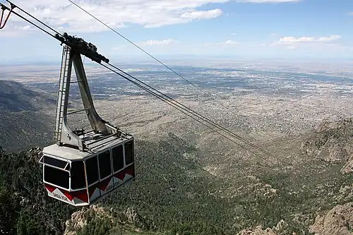 - 🌍 Sandia Peak Tramway, off Tramway Blvd on the NE corner of the city, ☏ +1 505 856-7325. Operates every 20–30 min from 9AM until evening (no morning rides on off-season Tu), with closures in April and November for maintenance. Runs from a lower terminus in the northeast heights to the top of 10,400-foot (3,200 m) Sandia Peak east of the city, and is one of the longest and most spectacular aerial tramways in the world. The first upward tram departs at 9AM (except Tu in the off season), and service continues until early evening. The 15-min ride to the top is incredible, bringing you right up to the rocky face of the Sandias. The view of the city from Sandia Peak is tremendous (especially after sunset), and there is a visitor center at the top. Closed for two weeks in spring and fall for "maintenance," but spring winds are so intense that you really don't want to be on an aerial tram then anyway. $25 round trip for adults, $20 round trip for seniors/military/students (age 13–20), $15 round trip for children, free for children under 5.