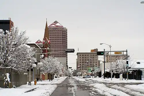 Albuquerque is in the high semi-desert [35.11N −106.64W (Elev. 4989 ft/1521 m)] and has a generally warm, dry climate with four distinct seasons. Spring is sunny and windy, although temperatures at night can be unexpectedly cool. Summers are hot (highs average around 93 °F (34 °C), lows 68 °F (20 °C), and it's not unheard of for highs to climb upwards to 100 °F (38 °C) with lows of 73 °F (23 °C) or above) and still mainly dry, but monsoonal conditions develop in July or August and produce furious if short-lived thunderstorms. Have rainwear available in the summer, although you won't use it most days. Fall is delightful, with comfortable temperatures and a return to generally dry conditions. Winter can be blustery, with overnight lows below freezing, but subzero temperatures are rare. One winter-weather issue for the traveler: snow, while infrequent and short-lived, does occur, and its relative rarity means that local drivers don't deal with it well. If you happen to be in town for a snowstorm, expect road chaos far out of proportion to the amount of snow that falls.