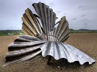 - 🌍 The Scallop, Thorpe Rd, IP16 4NR. A 2003 stainless-steel sculpture by Maggi Hambling commemorating Benjamin Britten, who lived in Aldeburgh from 1947 until his death in 1976. The 4-m-tall piece is made of two interlocking broken scallop shells. The main upright shell as cutouts reading "I hear those voices that will not be drowned", taken from Benjamin Britten's opera Peter Grimes. It is meant to be enjoyed both visually and tactilely, and people are encouraged to sit on it and watch the sea.