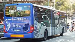 Bus C6 (☏ +34 902 106 992, alcoyana.ali@subus.es) connects the airport with the city, departing every 20 minutes from a bus stop at the departure level (level +2) of new terminal. Don't get confused between the departure level (level +2) and the bus level (level -2); the latter is used by charter buses. The city bus takes about 20 minutes to the city centre, where it follows a circular route. It stops near the Alicante bus station, at Plaza Puerta del Mar, near the Archaeological Museum, next to the central market, at Plaza Luceros, and on its way back to the airport near the train station. A one-way ride costs €4.50 (2025). Tickets can be purchased from an attendant on the platform either card or cash. The buses run 24/7; a complete schedule is available here.