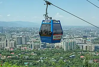 - ๐ Kok-Tobe Park. Small Soviet-esque fun fair perched on a hilltop, where the highlight is getting there on the cable car. (The base station is at Luganskiy 2, east end of Abay.) Up top is a series of overpriced rides, games and attractions, and two restaurants; the wildest beasts in the "mini-zoo" are some hens and goats. The park is fenced in with no access to the nearby mountains, but you can walk to or from town via the service road. Not to be confused with Kรถk Tรถbe hill further south. Adult return by cable car 6000 tenge, by minibus 3500 tenge.