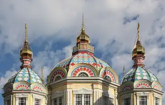 - ๐ Ascension Cathedral (Zenkov Cathedral), Gogol 40 (Panfilov Park, Metro Zhibek Zholy). Daily 07:00-18:00. Completed in 1907 and renovated in the 2020s - new saints were painted in, though presumably they were known to the hagiographers. The iconostasis is spectacular. At 56 m this among the tallest wooden buildings in the world, which you wouldn't guess from the smoothly-painted exterior hues of custard, icing sugar and coloured marzipan - it's more like a trap for Hansel & Gretel. Free.