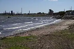 The street changes name to Rambla Edison and follows the coast for a while. Inland (on your left if you travel from west to east) there are oil containers and the 🌍 José Batlle y Ordóñez power plant. Along the sidewalk there are even a couple of palms, giving a little taste of what the route will look like when you're past the old town. But eventually the street will turn somewhat inland again. To the left there are railway tracks and to the right sea containers, hinting that you are arriving into the port area.