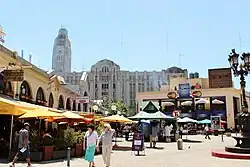 Making a twist to the right, Rambla Franklin D. Roosevelt separates the port from Montevideo's secondary bus station, 🌍 Terminal Río Branco also known as Terminal Baltasar Brum. Behind the bus station you can see the residential and office buildings of downtown Montevideo, the amount of graffiti has decreased. To the right, the 🌍 port with it's lower buildings, sea containers and trucks make up a more airy appearance than the industrial plants earlier along the road. You may even catch a glimpse of the sea again. If you are walking on the port side of the street - starboard actually - watch out for the truck traffic coming and going through the gates. In the horizon you can see the tower of the Art Deco Aduana (customs) building. Then there will be the 🌍 Ciudadela street to the left going to Plaza Independencia, the main square and heart of Montevideo and further to meet up with the Rambla on the opposite side of the old town.