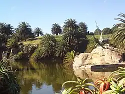 Heading south, Rambla Wilson briefly splits into two; cars leaving downtown follow the shore, then there is a 🌍 small grassy hill in the middle that you can climb for nice views of Centro and Ciudad Vieja. Interestingly it's named Plaza del Carnaval del Uruguay eventhough it's certainly not as flat as a "plaza". There is also an open air theater here. Further east there are the lanes going towards downtown and finally the beautiful 🌍 Canteras del Parque Rodó centered around a small lake named Lago Canteras, Lago Cachón or even Lago del Parque Rodó depending on the map. The Canteras is itself part of the Parque Instrucciones del año XIII.