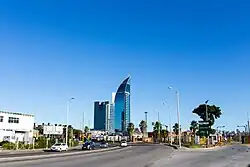 Northeast along Rambla Armenia, the tall palms have been replaced by lower ones and they are no longer placed evenly along the road. The houses are taller, further from the street and with more space between them. At one point you can look left to catch a glimpse of Montevideo's three 🌍 World Trade Center skyscrapers. The street makes a couple of turns, and changes name to Rambla República de Chile. Then it passes the 🌍 Zoological museum with its minaret-like tower to the right and the 🌍 Buceo cemetery to the left. And yet another beach with a faraway view; 🌍 Playa Buceo. The parallel road that goes up the bank connects to Bulevar José Batlle y Ordóñez, another of Montevideo's major thoroughfares.