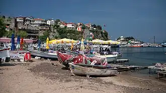 Amasra is a small harbour and beach resort on the Black Sea, 310 km north of Ankara in the Western Karadeniz region of Turkey. In 2021 it had a population of 6098, with about another 8000 in its outlying villages. It's the most attractive town on this coast and is mobbed in summer by tourists from Istanbul or Ankara.