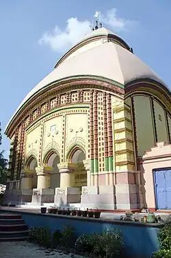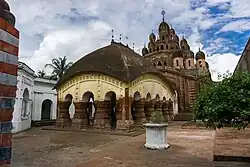 The Rajbari temple complex consists of several temples and other religious structures built over a period of more than a hundred years. It lies bang opposite the Nava Kailash complex. The complex houses two of the three 25-pinnacled temples of Kalna (incidentally there are a total of five 25-pinnacled temples in West Bengal). The complex is laid out with well manicured lawns crisscrossed with walkways. The lawns are laid out with flower beds and trimmed hedges.