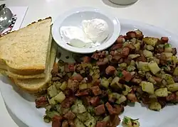 Many Americans routinely skip breakfast, and many restaurants don't open for it. Those that do serve eggs, toast, pancakes, waffles, hot and cold cereals, sausages, coffee, etc. Most restaurants stop serving breakfast between 10 and 11AM, while others simply switch to lunch service, but some, especially diners, offer an "all-day breakfast" menu alongside their lunch and dinner menus. Eggs are popular, and are most often seen in two basic versions: "eggs with" something and "eggs in" something. Eggs with potatoes are usually seen in diners or roadside restaurants, and eggs in some kind of bread are usually seen in fast-food or take-away places. In the first category, the eggs with potatoes can usually be had fried, scrambled, poached, or as an omelet, and the potatoes will usually be the regional interpretation of hash browns or home fries (pan-fried sliced potatoes). Alternatively, especially in the South, eggs with grits are quite common. You'll be able to choose whether you want to add meat (often bacon, sausage, hot ham, and sometimes a beef steak). In the second category, an egg may be fried and in an English muffin, a bagel, or a croissant, or scrambled and inside a taco or burrito.