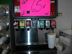Many restaurants, especially those offering free refills, place the soda machine in the dining area. If you order a soda and later want water, there is often a small lever near the ice machine to dispense water, using the same nozzle as one of the sodas. Many newer machines use touch screens to make a selection, and will simply make water a separate listing. These touchscreen machines will often allow for various flavors to be added to the drink selected, such as adding cherry flavoring to cola.
