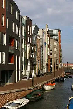 - π Floating houses, Haringbuisdijk, Steigereiland (tram 26 stop Steigereiland). There are two clusters of floating houses over a body of water. These small, modern houses are linked by a grid of walkways lined with railings holding life preservers and bicycles.