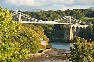 - Menai Suspension Bridge. Designed by Thomas Telford and completed in 1826, Menai Bridge