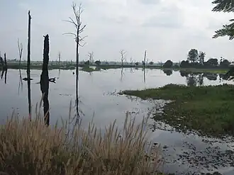- Anlong Veng Lake and Spillway (about 500 m N of the roundabout, the road comes very close to the lake). This man-made lake was conceived and carried out by Ta Mok. Many large trees were killed by the flooding, and their trunks jut skywards like huge grey bones. The lake is unsettling to look at, but local people love the spillway created in the rainy season. Fishing, boating and the general splashing around are available, with just as many spectators as participants.