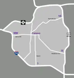 There are four main hotel districts in Ann Arbor: near campus; in the southern part of town, where State Street meets I-94 (including Boardwalk St, Briarwood Cir and Victors Way); in the southeastern part of town, near the intersection of Washtenaw Rd and US-23 (including Carpenter Rd); and in the northeastern part of town, by the intersection of Plymouth Rd and US-23 (including Green Rd). There are also a few in the northwestern part of town, near the intersection of Jackson Ave and I-94. Accommodations tend to be the most expensive in the campus area, so unless you're here for a conference or business trip that's being paid for, you'll probably want to look further out.
