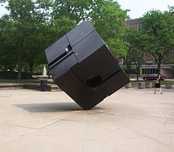 - 🌍 The Cube, Maynard Street and E Jefferson Street (Regents Plaza north of the Michigan Union). A 15-foot-tall, 2400-lb glossy black cube created by Tony Rosenthal; there's a similar one in the East Village of New York City. The Cube spins on its axis when pushed. Although Tony Rosenthal cubes often appear identical, the late artist always varied design elements on each of his cubes. Alamo has a distinctive curve element whereas Ann Arbor is more geometric.