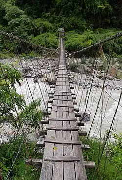 Starting at 🌍 Nayapul (1070 m), a collection of roadside shacks functioning as a bus and taxi stop, follow the jeep track down to a swingbridge. Cross the river, turn left, and walk for about half an hour along the Modi Khola to reach 🌍 Birethanti (1120 m). In Birethanti you must cross another bridge to present your ACAP conservation permit and TIMS card at the checkpoints. The easy valley trail continues for an hour to 🌍 Chimrong (1130 m) and another thirty minutes to 🌍 Syauli Bazaar (1220 m) before continuing on to New Bridge. From there the route matches the section above: climb to Jhinu Danda and continue on the staircases to Chomrong. Surfaces are a mix of dirt road, stone-paved trail, and long stepped sections.