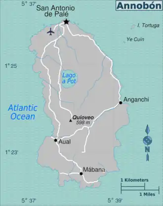 Annobón is an island in Equatorial Guinea, located farther out in the Atlantic Ocean on a line running through Bioko and the independent islands of Sao Tome and Principe. It is 670 km from Malabo.