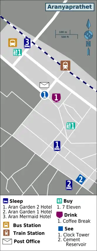 For the traveller, Aran's focus is the crossroads near the train station. Clockwise the roads go to the train station (northeast), to the border (southeast), to the clock tower and the town centre (southwest) and to the bus station (northwest). The town can serve as a staging point for journeys to various points in both Thailand and Cambodia, though the Bangkok-Siem Reap trip is the one that most travellers will undertake.
