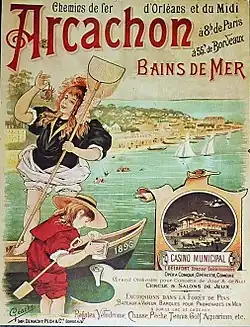 Arcachon is a beach resort near Bordeaux in the Nouvelle-Aquitaine region of Southwestern France. It has a fine beach and a mild climate said to be favourable for invalids suffering from pulmonary complaints.