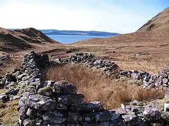 Γird nam Murchan in Gaelic means "headland of the great seas". The soil is poor and the terrain though of no great height is rugged. There are few natural resources, though lead was mined and oak forests managed for charcoal. The population mostly lived by crofting β subsistence farming β until the 19th century. Then the landowners realised they'd earn more from sheep-farming than from the meagre rents of their tenants, so the crofters were evicted. The emptiness of Ardnamurchan, as elsewhere in the Highlands, has been man-made by these "Clearances", of which the village of Bourblaige is a silent but eloquent witness.