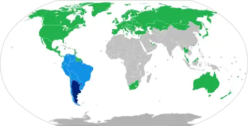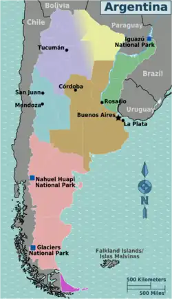 The Falkland Islands, a United Kingdom Overseas Territory, are claimed by Argentina as the Islas Malvinas, but as the archipelago is not under de facto Argentine rule, they are covered in their own article. That should not be construed as expressing approval or disapproval of either side's claims. |