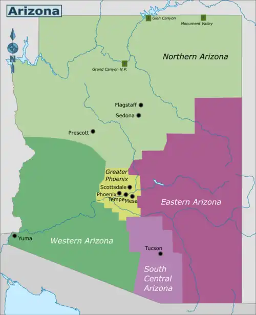 | Western Arizona Mostly high desert and irrigated farmland, especially off the Colorado River along the border with California, on the western edge. Includes Yuma in the southwest, Arizona's third most populous metro region after Phoenix and Tucson. |