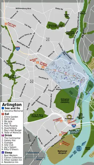 | Arlington National Cemetery Just across the Potomac River from Washington, D.C., adjacent to the Pentagon, this national military cemetery includes John F. Kennedy's tomb and the house of General Robert E. Lee (whose property this was, before it was seized during the civil war). This article also covers the areas surrounding the cemetery, including Fort Myer, the Pentagon grounds, and Columbia Island. |