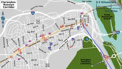 | Rosslyn–Ballston Corridor The dense Rosslyn-Ballston corridor is a series of five "urban villages" following Wilson and Clarendon Boulevards west from Rosslyn, just across the Potomac from Georgetown. This area has been massively redeveloped since the 1980s. While Rosslyn is largely offices and hotels, and depopulated at night, the pricey high-rises and group houses to the west are home to the largest concentration of restaurants, bars, and entertainment in Arlington— and to the young professionals who patronize them. The corridor is literally a textbook case of transit-oriented development, with the thriving neighborhoods of Courthouse, Clarendon, Virginia Square, and Ballston clustered around their eponymous Orange/Silver Line Metrorail stations. At the center is the shopping and restaurant district of Clarendon, which was Arlington's "downtown" until the 1960s. |