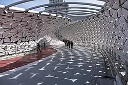 - 🌍 Pedestrian bridge (a bit north of the Ramstore bridge). Pedestrian only bridge with interesting architectonical features; it's covered with a mesh structure and has a curved form. There are nice views to the river and its banks from the bridge.