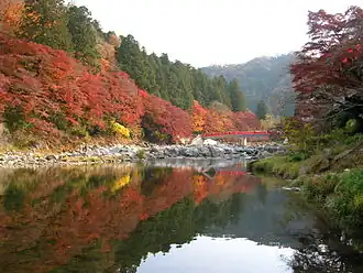The Korankei Gorge (香嵐渓) stretching 1.2 km upstream of the Tomoe River in Asuke-cho Miya-machi boasts its magnificent autumn foliage. Many tourists visit this gorge in mid-November when the colors of the leaves are at their best. The view of more than 4,000 trees with beautifully-colored leaves is truly a sight to behold. During the month of November, the trees are illuminated at nighttime to create a magical atmosphere with their leaves giving off a golden glitter.