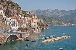 The town is located between the Civita Hill and Aureo Hill. Atrani is along the valley of the river Dragone, named for a legend saying there once was a terrible dragon that would breathe fire and would hide himself there.