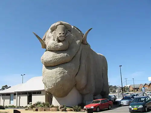 • 🌍 Big Merino, Goulburn (Hume Highway). One of the more impressive Big Things, this giant Merino sheep ram stands 15 meters tall and has a gift shop inside (selling merino wool products, of course), an observatory inside the head, and what are almost certainly Australia's largest testicles behind. Add in the location right off the Hume Highway and the pies at Trappers Bakery next door, and few travelers heading from Sydney to Canberra or Melbourne can escape its woolly charms. OSM directions target=_blank