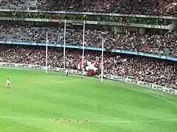 Australian rules football goal posts. Note the taller goal posts in the middle, and the shorter behind posts flanking them.