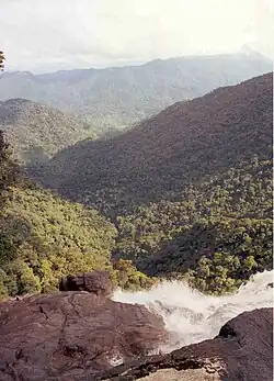 300-m drop waterfall, five-tier cascade lake. Forests, tropical and sub-tropical.